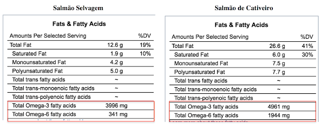 Outro ponto a salientar é a diferença nas quantidades de ácidos graxos específicos, como ômega 3 e ômega 6. Apesar de apresentar uma quantidade ligeiramente maior de ômega 3 que o peixe selvagem, o peixe de cativeiro apresenta também uma quantidade muito superior de ômega 6.