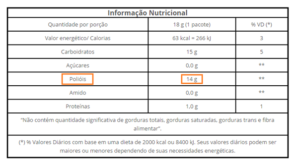 O rótulo traz o anúncio de que o produto pode causar efeitos laxativos quando consumido em excesso. Este alerta é feito devido à presença de substâncias conhecidas como polióis ou álcoois de açúcar, que são usados como edulcorantes. Ambos os edulcorantes encontrados na composição nutricional do produtos são do tipo poliol. A agência americana Food and Drug Administration (FDA) define polóis como carboidratos que possuem características químicas de açúcares e álcoois. Estes compostos são encontrados naturalmente em pequenas quantidades em diferentes frutas e outros vegetais e também são comercialmente produzidas a partir de açúcares e amido. Quando produzidos, são adicionados como adoçantes de baixa caloria em produtos livres ou reduzidos de açúcar, tais como goma de mascar, sobremesas, balas e coberturas. Além do sabor doce, os polióis conferem massa e textura, ajudam a reter umidade e previne o escurecimento do alimento. Em doces mastigáveis, a adição de alguns tipos de poliois ajudam a diminuir a incidência de cáries dentárias. Apesar das suas propriedades bromatológicas benéficas, o consumo destes compostos é frequentemente associado a distúrbios intestinais (Makinen, 2016) O maltitol é produzido a partir da hidrogenação de hidrolisados de amido e contém uma alta proporção de maltose, um dissacarídeo natural. Após a ingestão, o maltitol é lentamente hidrolisado por enzimas do intestino, gerando glicose e sorbitol. Ao passo em que a glicose é absorvida, a absorção do sorbitol é incompleta e este acaba sendo digerido pela microbiota intestinal. A fermentação dos poliois não absorvidos gera flatulência e, quando não fermentados, estes compostos provocam diarreia osmótica. (Ruskone-Fourmestraux, 2003) Um estudo de tolerância ao maltitol (Ruskone -Fourmestraux, 2003) realizado em adultos após ingestão ocasional e regular de chocolate contendo este tipo de edulcorante mostrou que apenas o seu consumo muito elevado é capaz de aumentar a frequência de diarreia nos pacientes. Entretanto, os pacientes avaliados no estudos eram adultos e sabe-se que a idade do consumidor pode influenciar na aceitabilidade dos poliois (Grabitske, 2008). Outros estudos (Livesey, 2001) demonstram o aumento da frequência de laxação relacionado à quantidade ingerida de sorbitol e maltitol presentes em diferentes tipos de produto. Quando a quantidade de 0.7 g de sorbitol por kg de massa corporal é capaz de provocar diarreia em 60% dos pacientes testados enquanto que a mesma frequência de eventos diarreicos é provocada por 0.6 g de maltitol por kg de peso corporal. Outros edulcorantes do tipo poliois – isomalte e xilitol – são conhecidos por causar efeitos laxantes mais pronunciados em crianças do que em adultos (Storey, 2002; Makinen, 2016). O destaque dado aos termos diet e natural sweets na embalagem poderia induzir o consumo exacerbado das balas por crianças e aumentar o risco de perturbações gastrointestinais. Uma legislação específica para produtos diet entendidos para uso infantil, como já ocorrem em outros países, como Austrália e Nova Zelândia (FSANZ), incluindo normas para rotulagem, poderia diminuir as probabilidades de ocorrência de tais eventos.