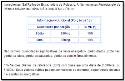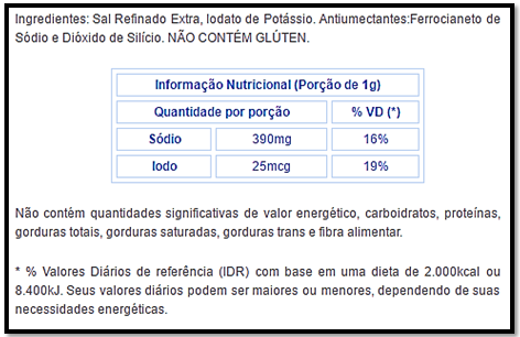 cristalizado, extraído de fontes naturais, adicionado obrigatoriamente de iodo,